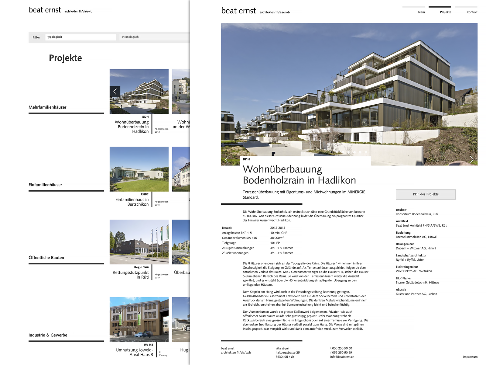 Webdesign for an architect in Switzerland. The client wanted an easy way to publish his projects. Furthermore we implemented an automatic PDF-creation based on the web-data. The PDF is styled to A3-format which is the format in Switzerland to submit for competitions. I love to work for architects because there is a understanding for lines, whitespace and grids.