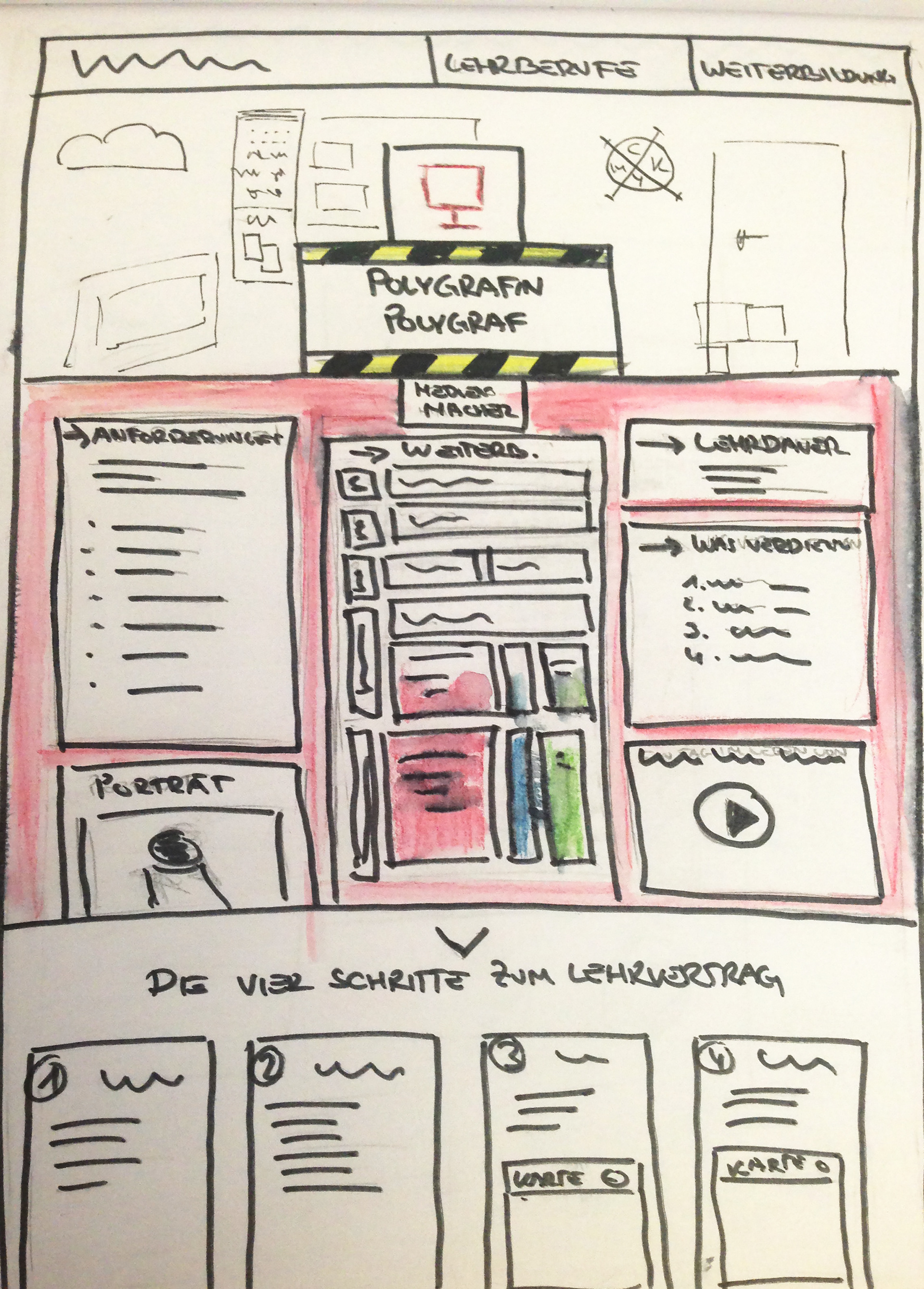 We were asked to the concept and design for a website with two different user-groups. The first group are young people who are searching for an apprenticeship in a media related profession. On the website they should have the possibility to read about the different professions, what they have to do to get a job and where apprenticeships are available. The second user-group are professionals who are looking into further education. We tried to make the differentiation with a lot of colors and comic-style images for the younger group. On the other side we worked with stylish images and less colors.